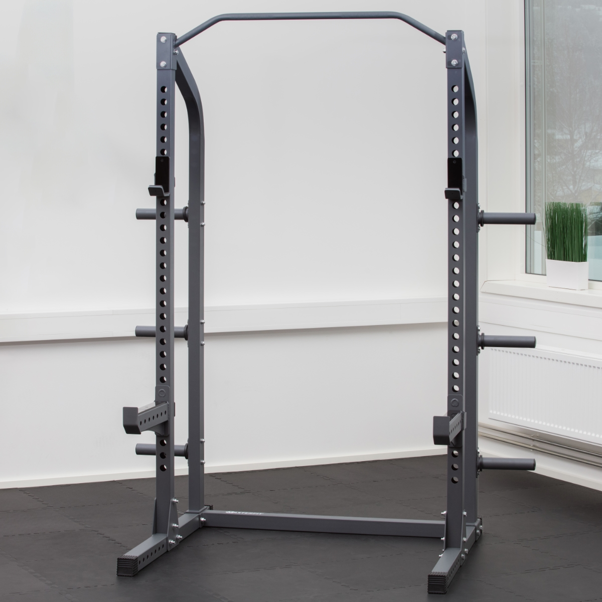 Half racket har tre opbevaringspinde på hver side med maksimal belastning på 75 kg pr. pind. Det gør det nemt at organisere vægtskiverne og hurtigt skifte belastning mellem sættene. Pull-up-stangen har en diameter på 29 mm med knurling for godt greb og tåler belastning op til 150 kg. Den kan monteres i to forskellige højder, så den samlede højde bliver enten 213 cm eller 205 cm, hvilket gør racket velegnet til rum med lavere loftshøjde.
