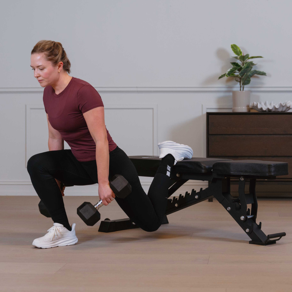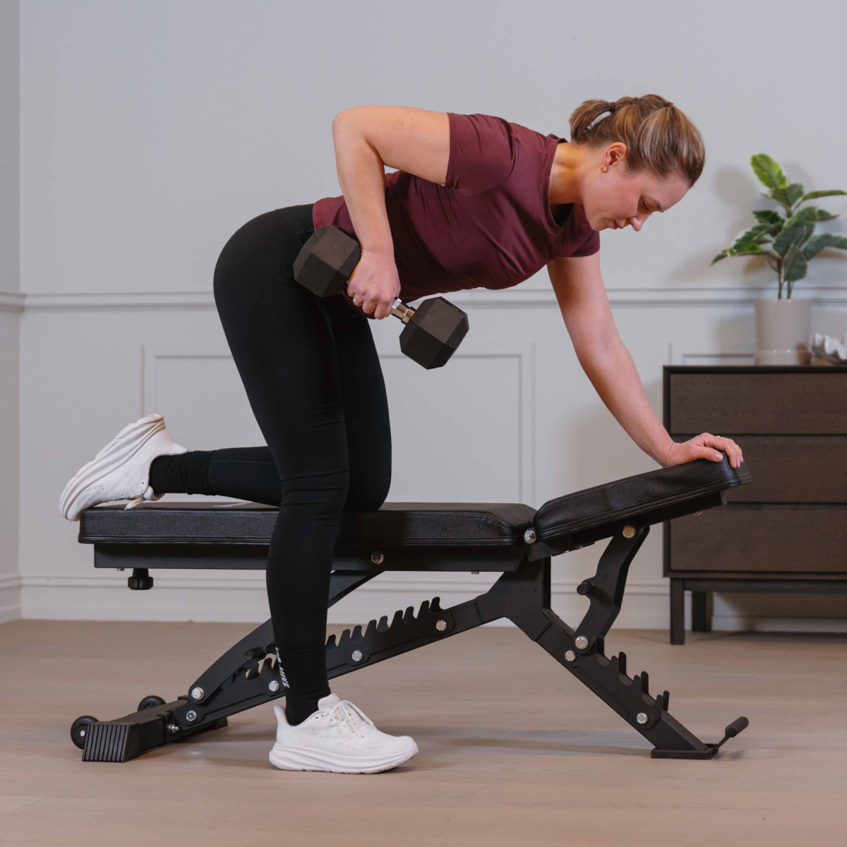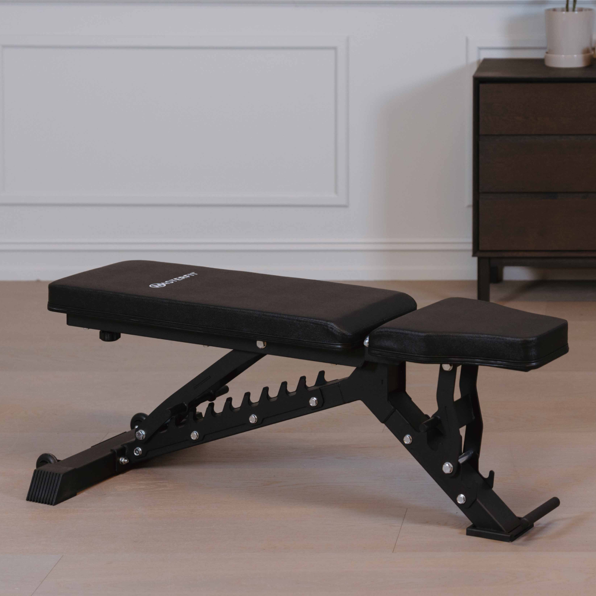 Justerbar træningsbænk udviklet til styrketræning med både håndvægte og vægtstang. Flere justeringsmuligheder giver god støtte i øvelser for bryst, skuldre, ryg og arme.