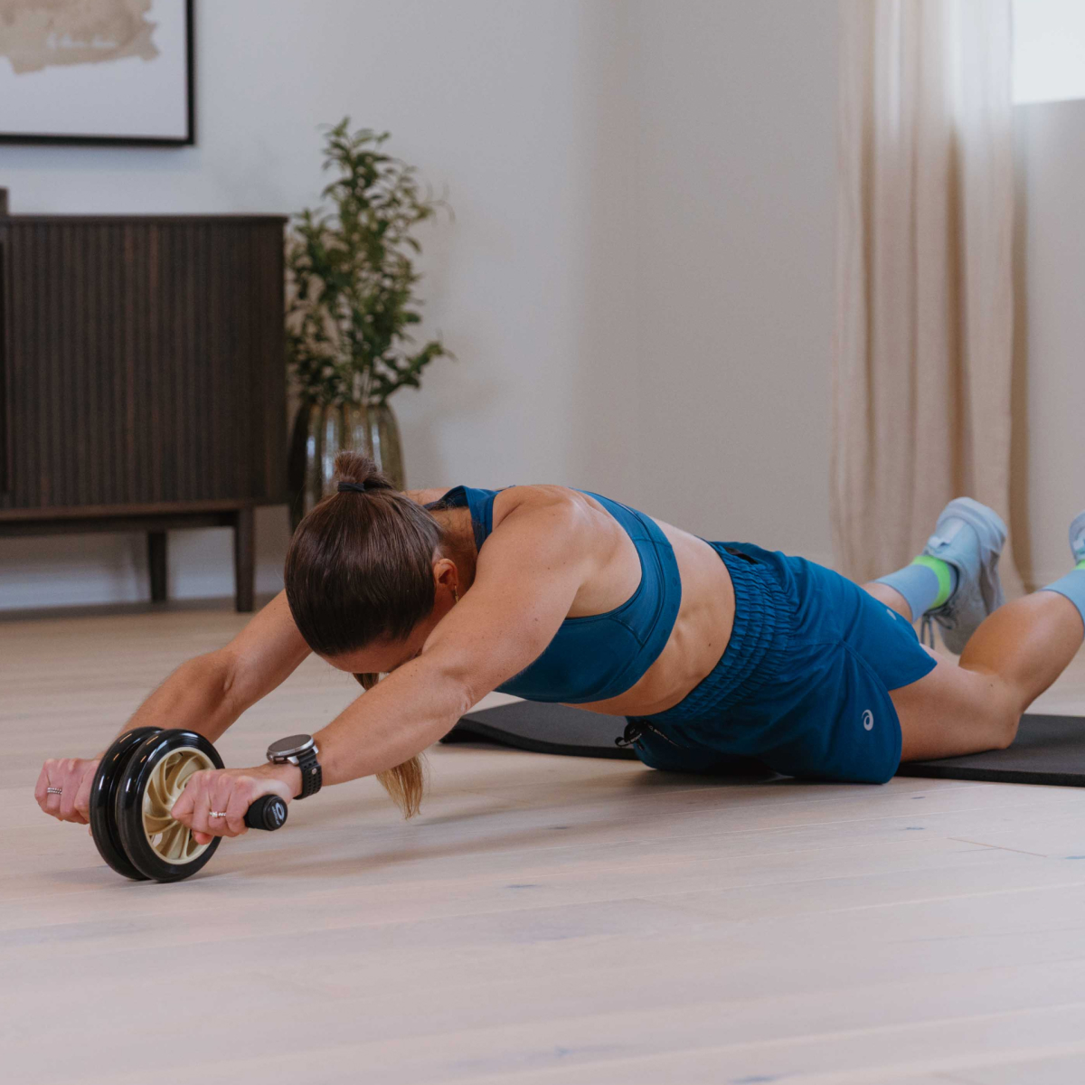 Eftersom du blivere stærkere ruller du længere og længere ud. For ekstra mavetræning løfter du knæene op fra gulvet, og rører kun gulvet med tæerne, samtidigt med du holder ryggen strækt. Dobbelhjulet giver en god stabilitet.