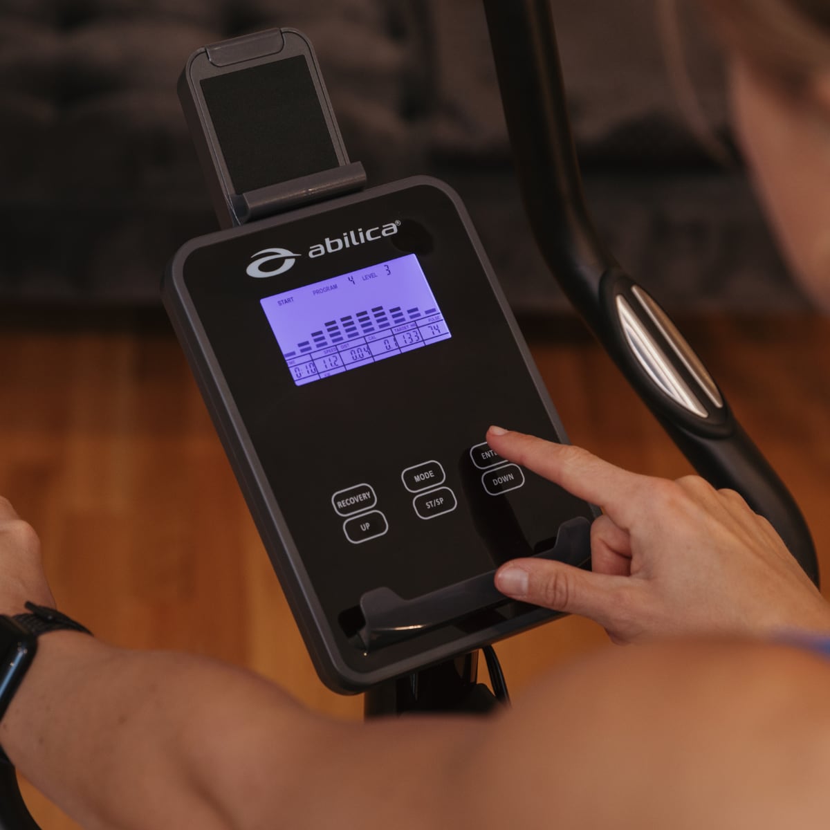 Den har et moderne design og et lavt indstigningsniveau, som gør det nemt at komme af og på cyklen. Abilica Bike 20 er udstyret med motoriseret modstand med 16 forskellige niveauer samt en computer med 18 programmer, der giver en motiverende og varieret træningshverdag. Cyklen leveres med håndpulssensorer, som kan aflæses direkte i displayet.