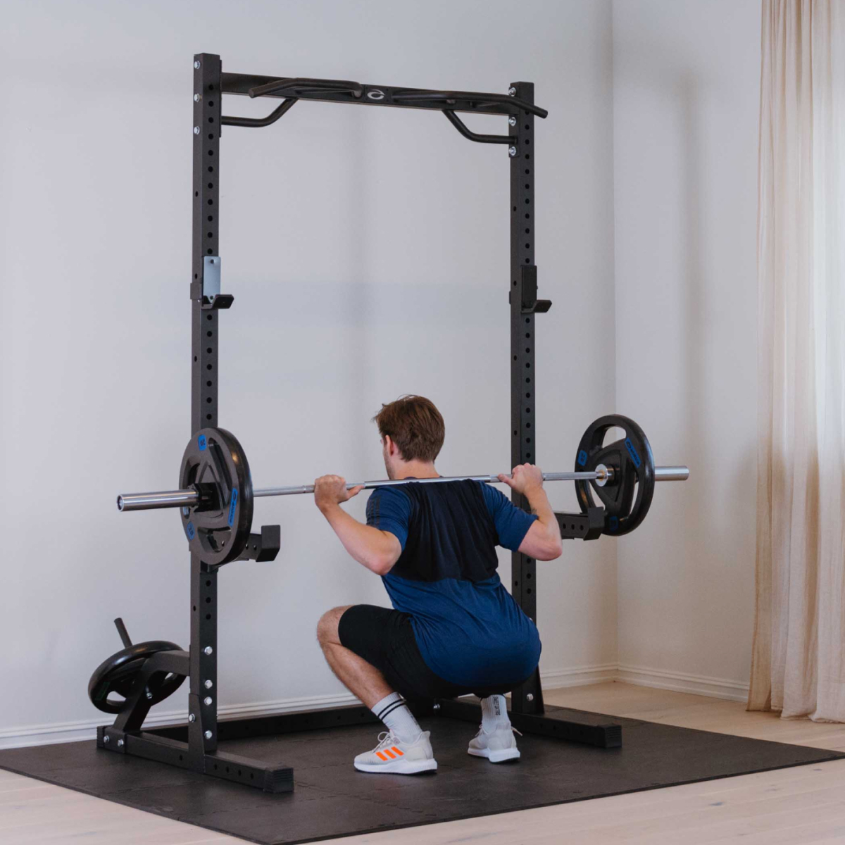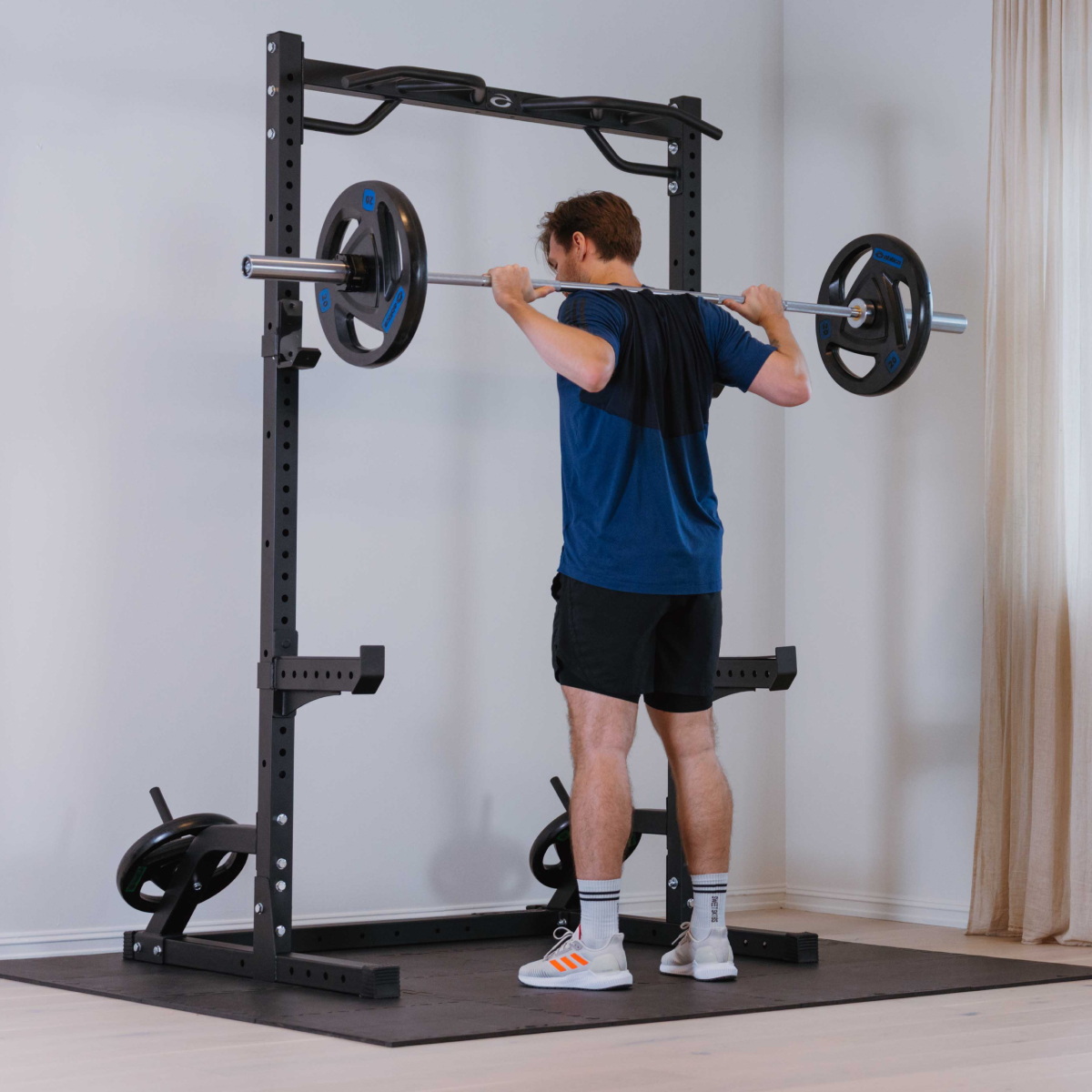 Med god plads inde i stativet er der rum til en bænk, hvilket gør den ideel til træning af både basisøvelser og støtteøvelser. Hvis du ønsker et enklere setup, kan du købe ekstra vægtstangsholdere, så du har færdigindstillede holdere til forskellige øvelser.