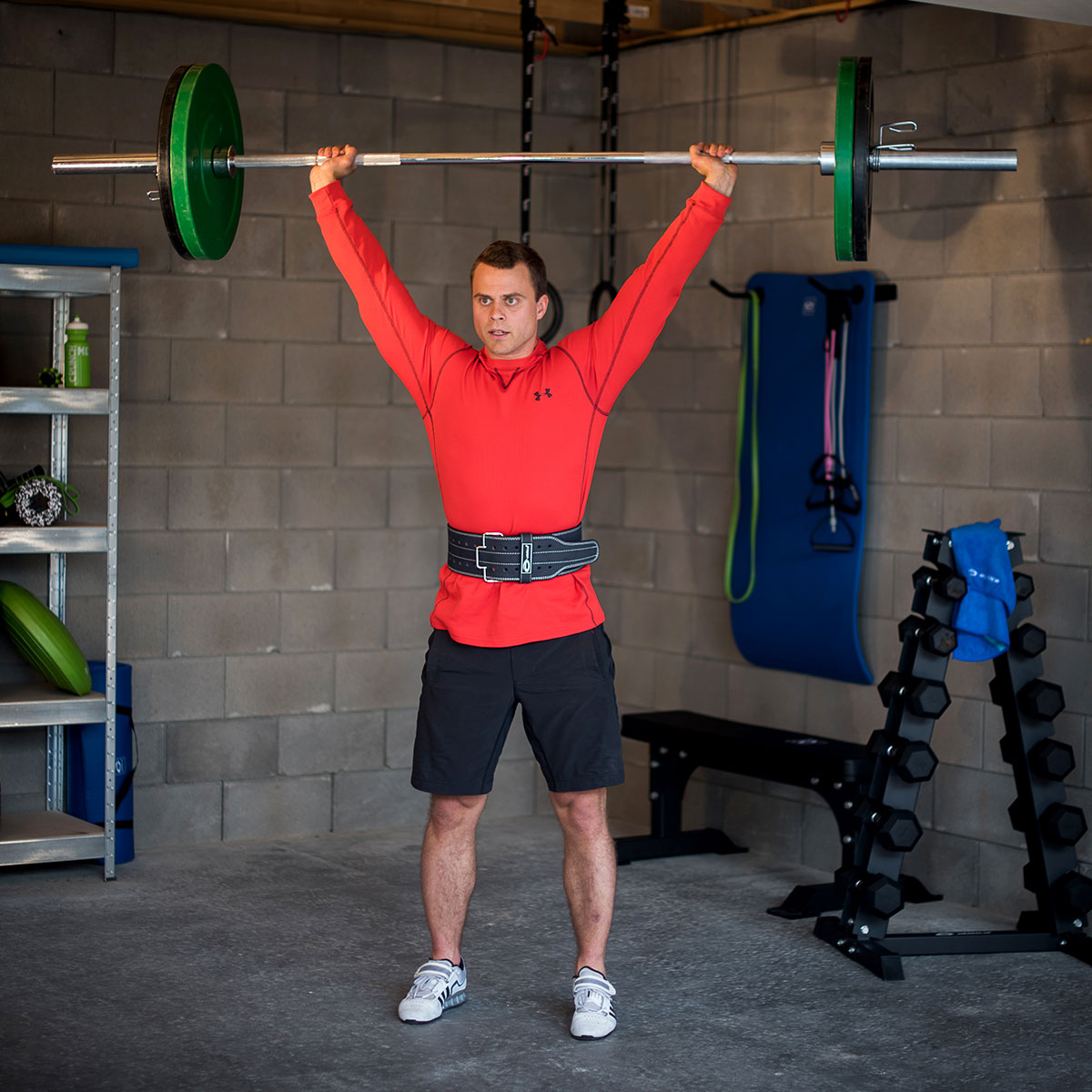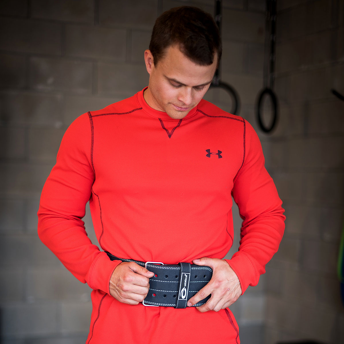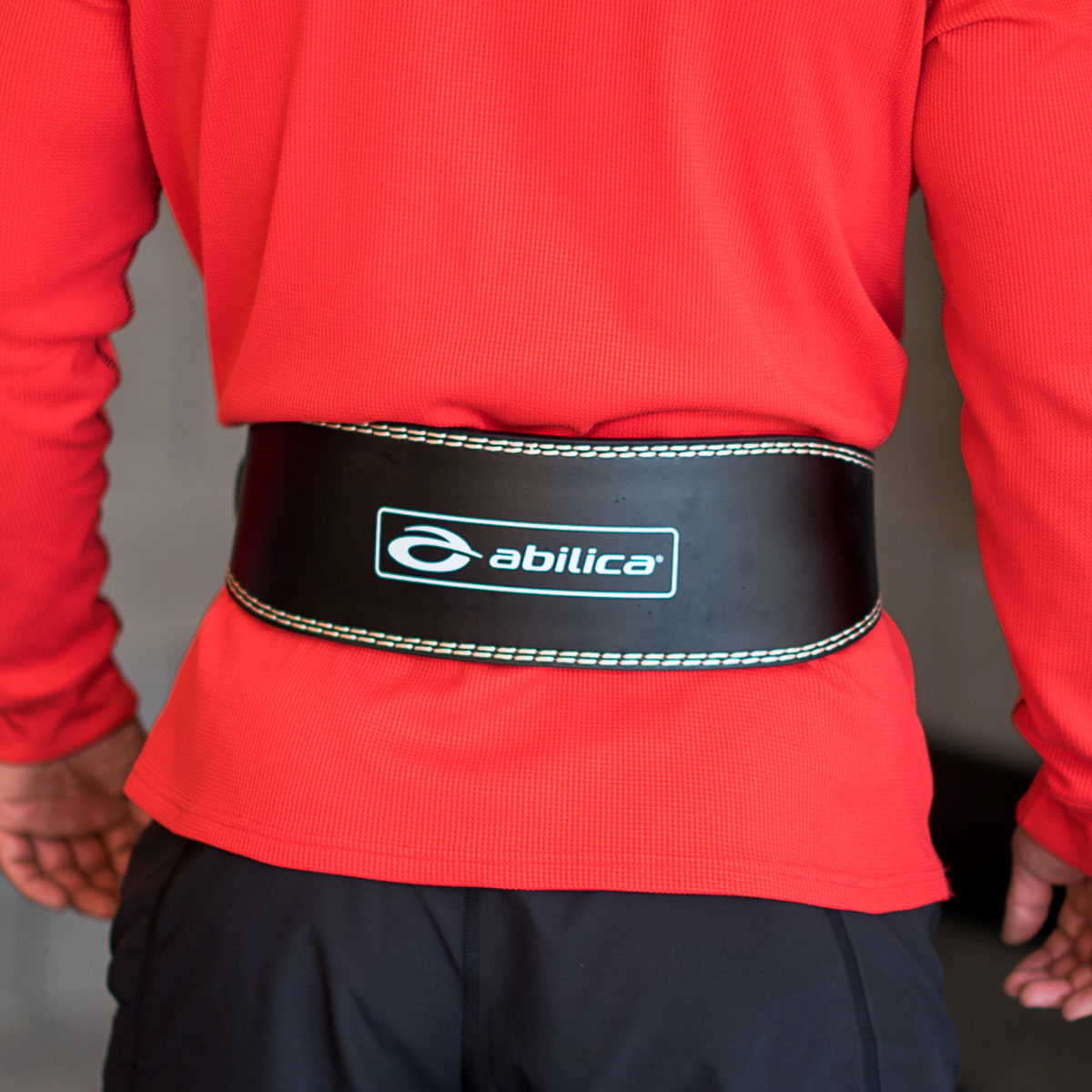 Styrkeløftbælte i kraftig læder, som giver god støtte og beskyttelse for ryggen ved styrkeløft.