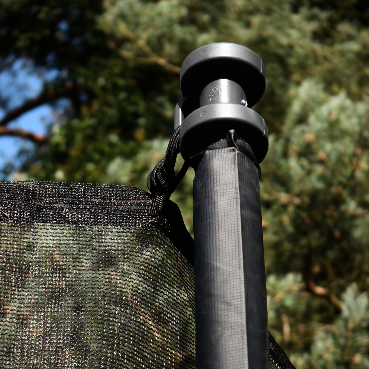 Sikkerhedsnettet har overlappende indgang, der lukker automatisk, hvilket både øger sikkerheden og bidrager til længere levetid på nettet. Nettet er finmasket for at forhindre, at fingre eller tæer sætter sig fast, og stolperne går helt ned til jorden for stabil og enkel montering. Stolperne er godt polstrede og udstyret med solide plastkopper, som holder nettet stramt og sikkert på plads med elastiske snore. Det fordeler belastningen jævnt og forlænger levetiden på både net og fastgørelse.