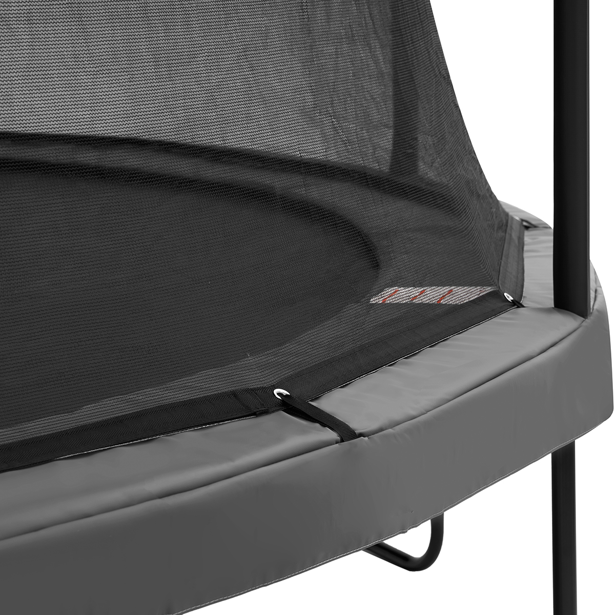 Det patenterede fastgørelsessystem mellem net og ramme giver ekstra støtte og stabilitet under hop. Belastningen fordeles jævnt, hvilket bidrager til en mere stabil konstruktion over tid. En integreret stålring i toppen af nettet holder nettet stramt og stabilt, også efter længere tids brug.