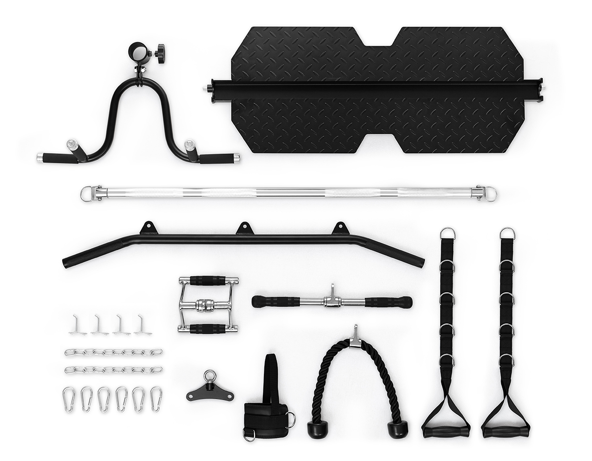 Racket leveres komplet med integreret smithstang, lat-pulldown, siddende roning, lavt træk, højt træk, flyes, rotationsøvelser samt en lang række andre funktionelle styrketræningsredskaber, der udvider øvelsesmulighederne.