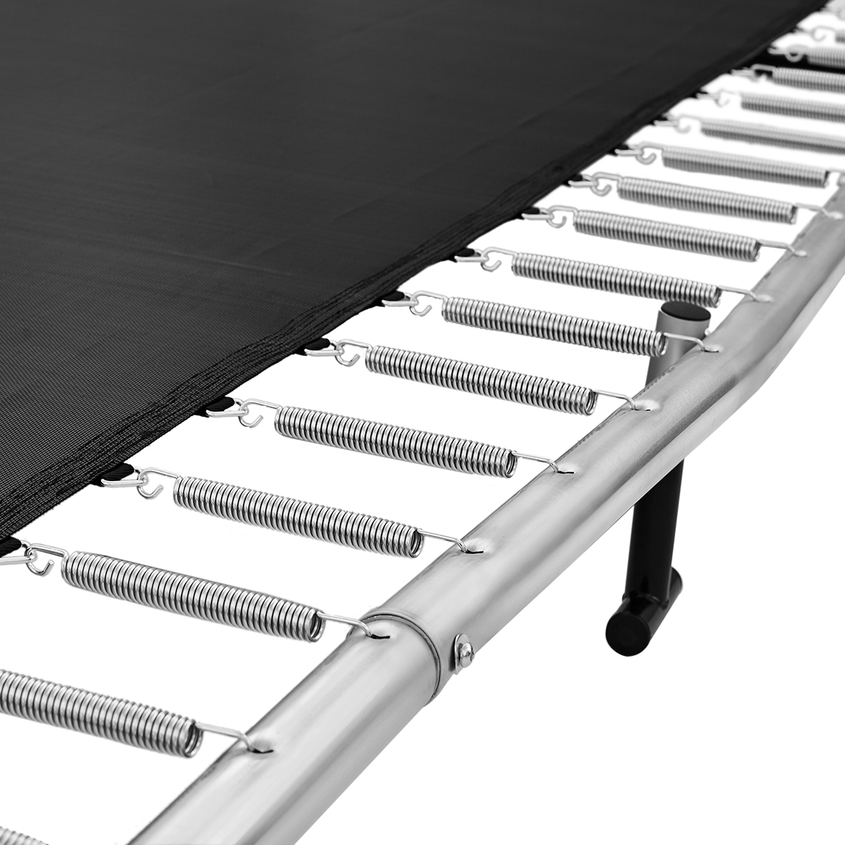Jumpmaster Premium Rektangulær Inground Sport Line Trampolin 4,57 x 3,05 m. er udstyret med 84 bløde galvaniserede fjedre, som arbejder sammen med den specialudviklede Premium hoppedug. Hoppedugen slipper mere luft igennem end traditionelle duge. Når luftmodstanden reduceres, bruges mere af energien direkte i selve hoppet.