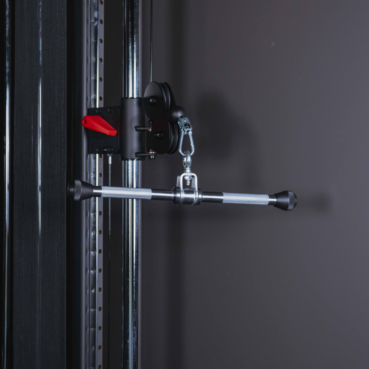 Hardchrom giver et flot, mat udseende, som er korrosionsbestandigt, har god slidstyrke og giver en fantastisk grebsfornemmelse. Legeringen er tyndere end almindelig krom, hvilket giver bedre struktur i serrateringen på håndtaget, samtidig med at den matte finish ikke er glat, hvilket gør den ekstra velegnet til fugtige hænder. Stangen er udstyret med roterende fæste, så du kan holde samme greb igennem hele øvelsen. Passer perfekt til biceps curl og triceps pres fra kabel. Stangen har en længde på 55 cm med gummibeskyttelse i hver ende. Den har 2 områder med serratering på 11,5 cm. Diameteren på grebet er 26 mm.