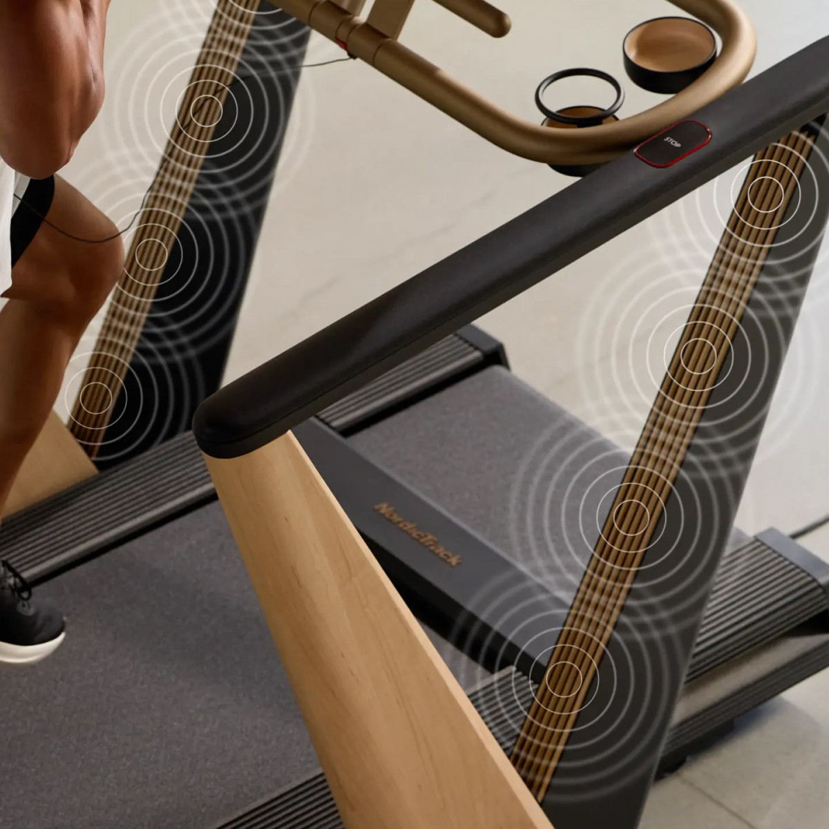 Et højkvalitets lydsystem med otte højtalere omgiver dig med naturlyde og dynamisk musik, der forstærker oplevelsen. Samtidig tilpasser automatiske blæsere sig efter intensiteten i træningen, så du holder dig afkølet og får følelsen af at løbe udendørs.